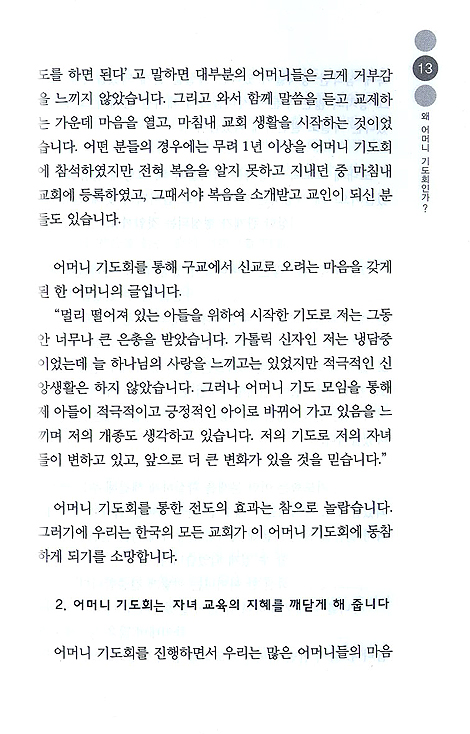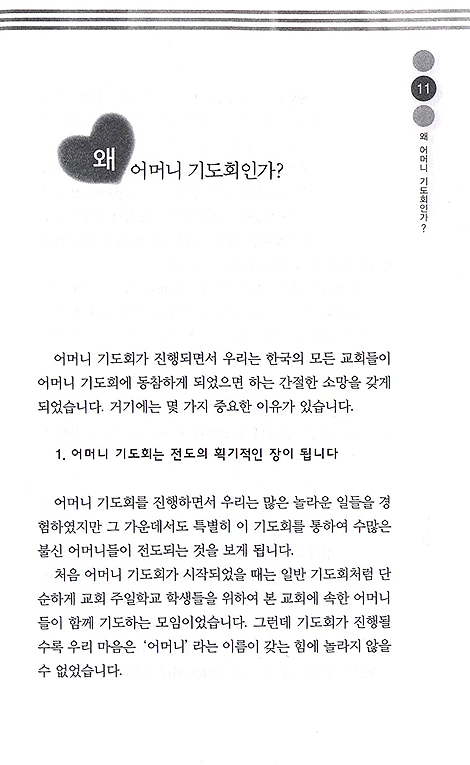 이름하여 '어머니 기도회' 였습니다. 약 30 여명의 어머니들이 함께 교회 교육관에 모여서 자녀를 위해 기도하기 시작했습니다. 첫 모임부터 놀라운 감동이 있었습니다. 함께 기도한 모든 어머니들의 얼굴은 한결같이 눈물에 젖어 있었습니다.