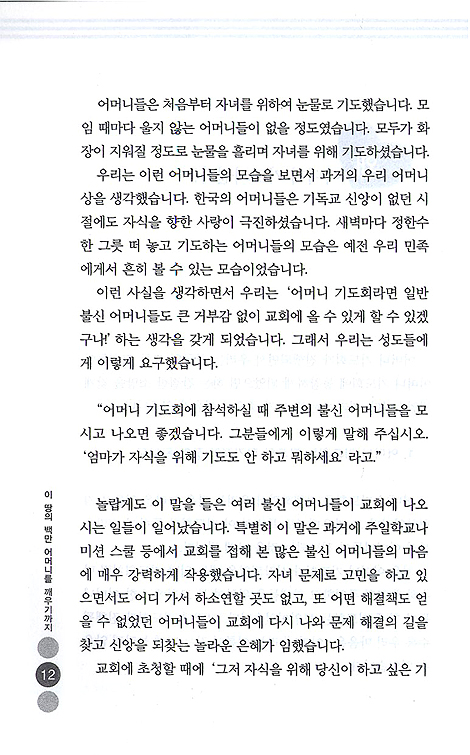 그런데 놀랍게도 상당수의 불신 어머니들이 별다른 거부감 없이 어머니들의 초대에 응하는 모습을 보게 되었고 이로 인하여 기도회는 힘 있게 부흥하기 시작했습니다. 30명으로 시작한 기도 모이이었습니다. 하지만 지금은 최다 회집 인원이 1,000명에 이를 정도로 큰 부흥이 일어났습니다.
