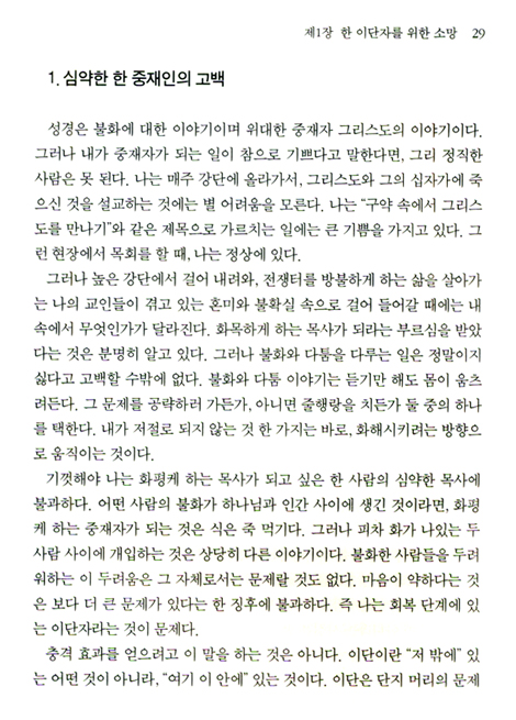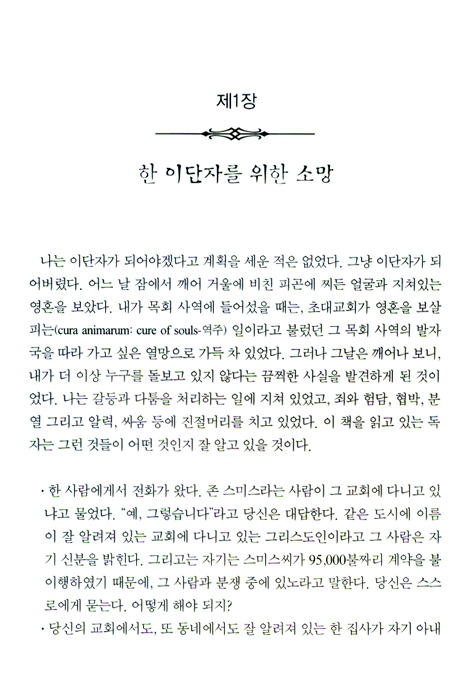 이 책은 타협의 기술서가 아니라, 목회자가 하나님의 자비와 능력에 자기 자신을 던지는 것을 탐구한 책이다. 하나님의 은혜로 갈등을 치유할 수 있다는 믿음을 가지고 살겠다고 다짐할 준비가 되어 있다면, 이 책을 읽으라. 그리고 기도하고 설교하고 상담하라.