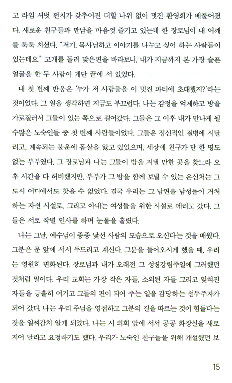 내 첫 번째 반응은 ‘누가 저 사람들을 이 멋진 파티에 초대했지?’라는 것이었다. 그 일을 생각하면 지금도 부끄럽다. (중략) 나는 그날, 예수님이 종종 낯선 사람의 모습으로 오신다는 것을 배웠다. 그분은 문 앞에 서서 두드리고 계신다. 그분을 들어오시게 했을 때, 우리는 영원히 변화된다. 장로님과 내가 오래전 그 성령강림주일에 그러했던 것처럼 말이다. 우리 교회는 가장 작은 자들, 소외된 자들 그리고 잊혀진 자들을 긍휼히 여기고 그들의 편이 되어 주는 일을 감당하는 선두주자가 되어 갔다.