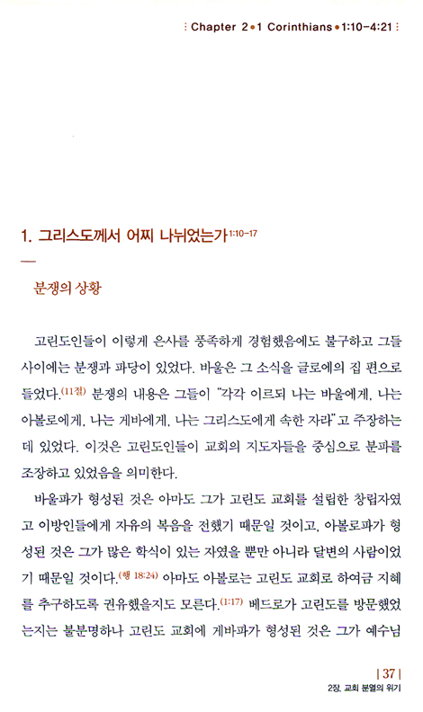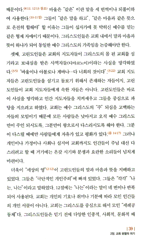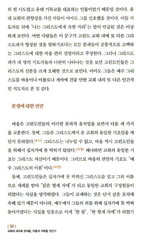 1세기 고린도 교회는 오늘날 한국교회와 여러 면에서 많이 닮았다. 교회는 세상을 변화시키기 위해 부르심을 받은 거룩한 공동체이지만, 오늘날 교회가 세상을 변화시키는 것이 아니라 도리어 세상이 교회를 변화시키는 세속화 현장이 심화되고 있다. 세상이 교회 안에 깊숙이 파고 들어와 세상인지 교회인지 분간하기 어려울 정도로 교회와 세상의 경계선이 모호해져가고 있다. 교회는 세상을 변화시킬 능력을 상실한 채 도리어 세상의 지탄의 대상이 되어가고 있다.