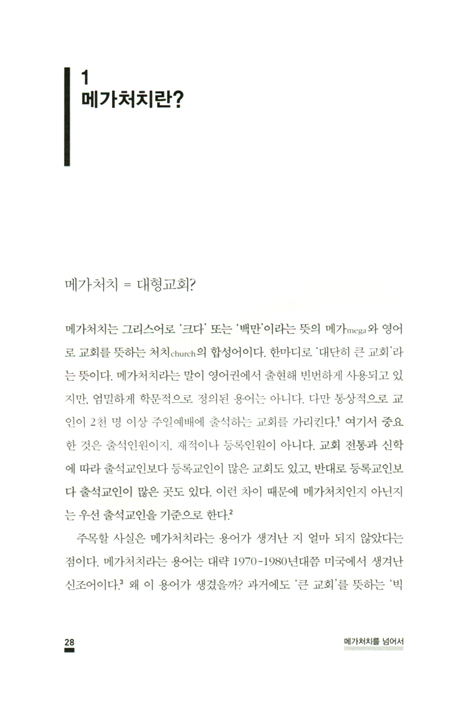 가령 어느 지역에 70명 남짓한 교회와 10만 명이 모이는 메가처치가 이웃하고 있다고 상상해보자. 두 교회가 미치는 사회적 반향이 다르다는 점은 따로 설명하지 않아도 알 수 있다. 70명이 모이는 교회는 그런 교회가 있는지조차 모르는 사람이 태반일 것이다. 하지만 10만 명이 모이는 교회는 예배 때마다 몰려드는 신자와 차량으로 일대가 마비되고 거대한 상권이 형성될 것이다. 때문에 이런 교회가 선포하는 메시지나 기획한 행사들이 강력한 사회적 파장을 만들어낼 것은 쉽게 예상할 수 있다. 이런 특성 때문에 메가처치는 단순히 개별 교회가 아니라 사회적 현상으로 보고 접근해야 한다. 특히 비메가처치들이 메가처치를 모방하려고 애쓸 때, 사회적 파장과 영향력은 더욱 극적으로 증가한다. 메가처치를 중심으로 한 광범위한 종교사회적 영향력이 바로 메가처치 현상을 만들어낸다.(37-38쪽)