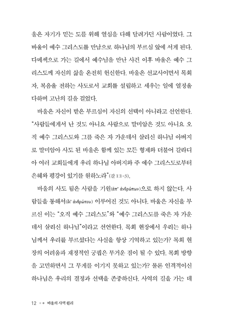 이 책은 바울이 자신의 소명을 어떻게 이해했는지, 바울의 사역 원리는 무엇이었는지를 핵심적으로 정리한다. 이 책을 읽다 보면, 각자의 소명을 성실하게 이루고 십자가 복음대로 살고자 하는 열정을 다시 갖게 될 것이다. 교회 사역자들과 직분자들이 함께 이 책을 읽고 각 장에 수록된 질문을 가지고 토론하면서 목회와 선교의 올바른 방향을 설정할 수 있기를 기대한다.