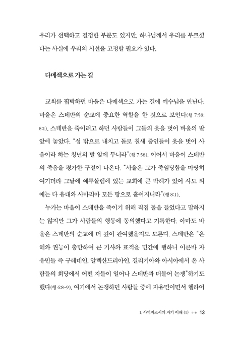 나를 사역자로 부르신 분은 누구인가? 내가 목회를 하고 복음 전도 사역을 하게 된 것은 누구의 선택과 결정 때문인가? 나는 어릴 때부터 교회 안에서 성실하게 배우고 훌륭하게 자라왔으니 목회를 할 만한 자격이 충분하다고 내심 생각하지는 않는가? 다메섹으로 가는 길에서 예수님이 바울을 부르는 사건은 우리도 바울과 같이 자격을 전혀 갖추지 못한 죄인이지만 하나님의 놀라운 구속 사역에 동참하도록 부르심을 받았다는 것을 알려 준다. 내게 있는 내적인 소명은 내가 결심해서 생겨난 것이 아니다. 예수 그리스도의 십자가를 경험한 우리를 사역자로 부르신 분은 하나님이시고, 우리는 성령의 조명을 따라 계속해서 이 길을 가야 한다.