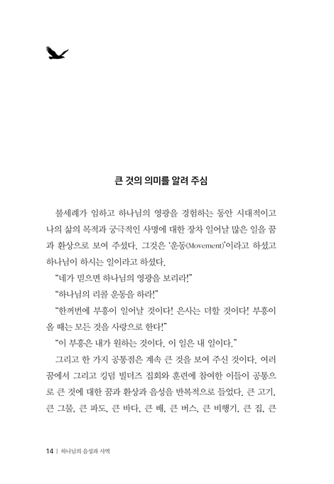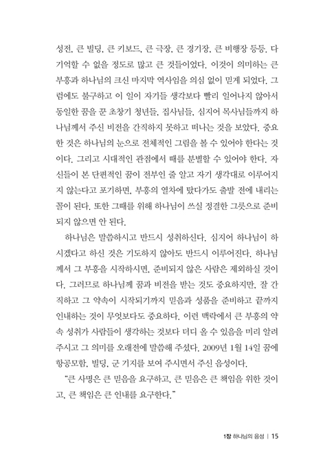 성경은 마지막 때 물이 바다 덮음 같이 여호와의 영광을 아는 지식이 세상에 가득할 것을 예언했다(합 2:14). 이제 예수님 재림 전에 전 세계적인 추수로 이어질 전무후무한 부흥이 시작될 것이다. 이제부터 일어나는 부흥은 우리의 상상을 초월할 것이다. 존 웨슬리, 무디, 찰스 피니, 조나단 에드워드의 부흥, 아주사 부흥과 오순절 운동, 20세기 중반에 일어난 늦은 비 운동, 평양 대부흥 등을 합한 것보다 더 강력한 대부흥이 밀려올 것이다. _94쪽에서
