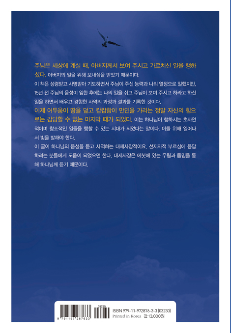 주님은 세상에 계실 때, 아버지께서 보여 주시고 가르치신 일을 행하셨다. 아버지의 일을 위해 보내심을 받았기 때문이다. 이 책은 성령받고 사명받아 기도하면서 주님이 주신 능력과 나의 열정으로 일했지만, 15년 전 주님의 음성이 임한 후에는 나의 일을 쉬고 주님이 보여 주시고 하라고 하신 일을 하면서 배우고 경험한 사역의 과정과 결과를 기록한 책이다.