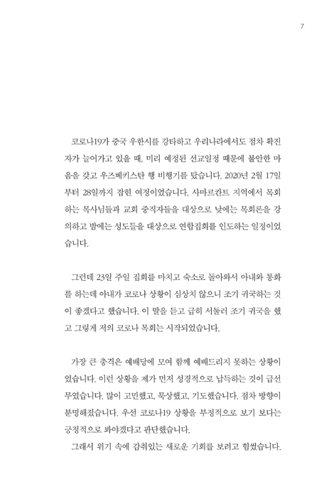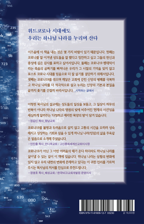 이 서문을 써 내려가는 제 마음에 여러 번 눈물이 고입니다. 교인 없이 텅 빈 예배당을 바라보며 주일 1부, 2부, 3부 예배시간에 맞춰 설교할 때의 심정이 생각나 울컥합니다. 성도가 소천 했는데도 장례식장에 들어가지 못해 줌ZOOM으로 장례 예배를 인도했던 그 착잡함이 떠올라 가슴이 시립니다. 주일에 못 오니까 평일에 교회와서 교역자들에게 간식거리를 건네주던 그 사랑에 눈물이 납니다.