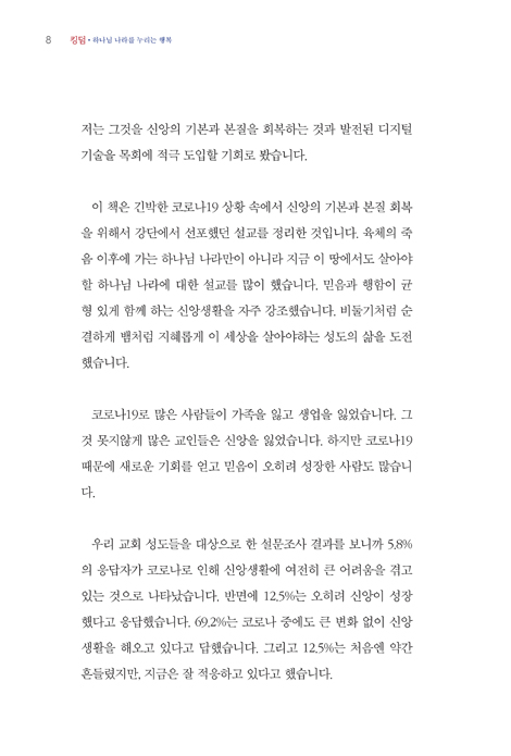 이 책은 긴박한 코로나19 상황 속에서 신앙의 기본과 본질 회복을 위해서 강단에서 선포했던 설교를 정리한 것입니다. 육체의 죽음 이후에 가는 하나님 나라만이 아니라 지금 이 땅에서도 살아야 할 하나님 나라에 대한 설교를 많이 했습니다. 믿음과 행함이 균형 있게 함께 하는 신앙생활을 자주 강조했습니다. 비둘기처럼 순결하게 뱀처럼 지혜롭게 이 세상을 살아야하는 성도의 삶을 도전했습니다.