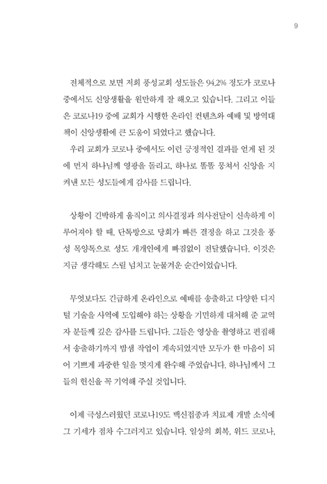 우리 교회가 코로나 중에서도 이런 긍정적인 결과를 얻게 된 것에 먼저 하나님께 영광을 돌리고, 하나로 똘똘 뭉쳐서 신앙을 지켜낸 모든 성도들에게 감사를 드립니다.