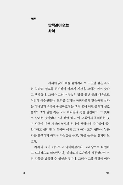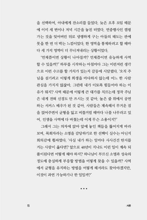 목회자와 사역 리더로서 우리가 당면한 일부 문제는 균형 잡힌 사역이 무엇인지 알려줄 역할 모델을 거의 찾을 수 없다는 데 있다. 사실 매우 성공한 일부 사역 리더의 말을 들어보면, 균형은 그리스도를 열정적이고 효과적으로 섬기는 데 방해가 될 뿐이라고 한다. 그들은 균형이라는 전체 개념을 평범함과의 타협에 불과한 것이라고 부정적으로 받아들인다. 그리고 “중요한 부분에서 희생을 각오하지 않는다면, 어떻게 교회나 사역에 강력한 영향을 미치고 의미 있는 변화를 이끌어낼 수 있겠습니까?”라고 반문한다. 그런데 만약 이 희생의 대상이 우리와 관련한 것이 아니라 주님의 고유 영역과 관련했다고 생각하면, 이런 질문은 상당히 불순하다. 서론. p. 17