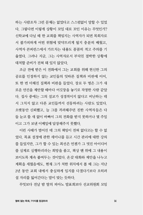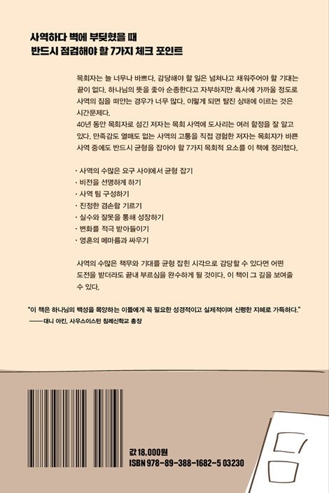 사역이 벽에 부딪혔다면, 위의 7가지 요소 중 어떤 부분이 균형을 이루지 못한 상태일 수 있다. 이에 목회자는 이 책을 읽으며 자신의 현 상태를 점검하고, 당면한 어려움을 극복할 힘을 얻을 수 있을 것이다. 사역하다가 지친 목사, 사역 방향을 다시 찾으려는 목사, 열정을 회복하고 싶은 목사, 눈에 보이는 성과를 내야 한다고 스스로 채찍질하는 목사에게 이 책은 위로가 되고, 다시 자신의 소명을 확인하게 해주는 계기가 될 것이다.