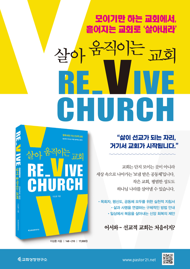 『Re_Vive Church : 리바이브 처치』는 이 전환의 여정을 함께하는 길잡이다. 신학적 용어나 이론에 치우치지 않고, 삶의 언어로 풀어낸 이 책은 가정과 일터, 그리고 내가 속한 공동체에서 그리스도의 증인으로 살아가려는 모든 그리스도인을 위한 선교적 교회의 길잡이다. 본문 곳곳에는 적용 가능한 사례들이 담겨 있으며, 각 챕터 말미에는 핵심 메시지와 함께 ‘생각 열기 ― 삶과 연결 ― 함께 고민하기 ― 실천하기’의 흐름으로 구성된 소그룹 나눔 가이드가 제공된다. 개인 묵상은 물론 공동체 내에서 함께 읽고 나누고 살아내는 데도 유용하다.