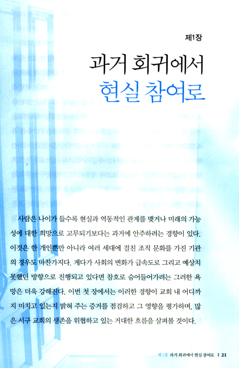 시대의 변화에 따라 교회도 그 모습을 조금씩 바궈나갑니다. 교회가 증거 하는 복음의 본질은 변하지 않지만 교회의 형태부터 운영 시스템까지 교회를 구성하는 여러 가지 것들이 정치, 경제, 사회, 문화에 맞춰 조금씩 달라져 왔습니다. 진정한 변화는, 변해야 할 것과 변하지 말아야 할 것이 무엇인지를 정확하게 파악하고 변하는 것입니다. 이 책을 통해 한국에 수많은 교회들이 정확한 모습을 평가하고, 하나님이 원하시는 미래를 바라볼 수 있는 시각이 형성되기를 기대합니다.