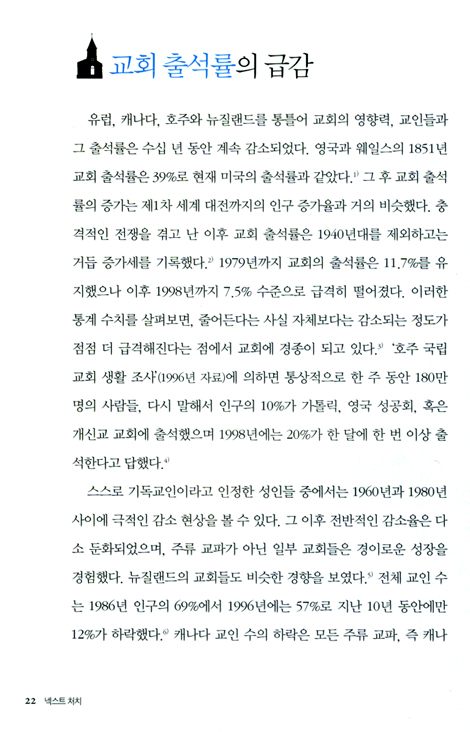 『넥스트 처치』는 새로운 도전에 대한 대응으로서 교회의 나아갈 방향을 알려 주는 살아 있는 대안입니다. 교회의 변화에 대한 책들은 많습니다. 그러나 어딘가 균형을 잃은 듯하고 현실적이지 못하다는 느낌을 많이 받습니다. 건강한 교회의 회복을 위해 고민하는 이에게는 시원한 청량제와 같은 자극이 될 것이기에 이 책을 추천합니다.