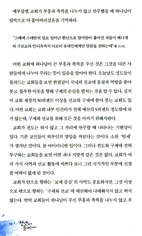 청년들에게는 체력, 시간, 열정, 지식이 차고 넘친다. 하나님이 주신 이러한 강점들을 복음과 하나님의 나라를 위해 드린다면 엄청난 기적과 역사가 일어날 것이다. 이 책이 청년 부흥의 돌파구가 되고, 잠자는 많은 젊은이들을 깨우는 촉매가 되어 교회의 청년대학부마다 기도의 바람, 성령의 바람, 예배의 바람, 전도의 바람이 세차게 불기를 바란다.