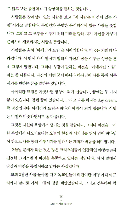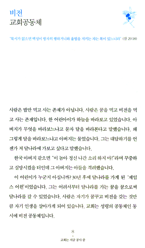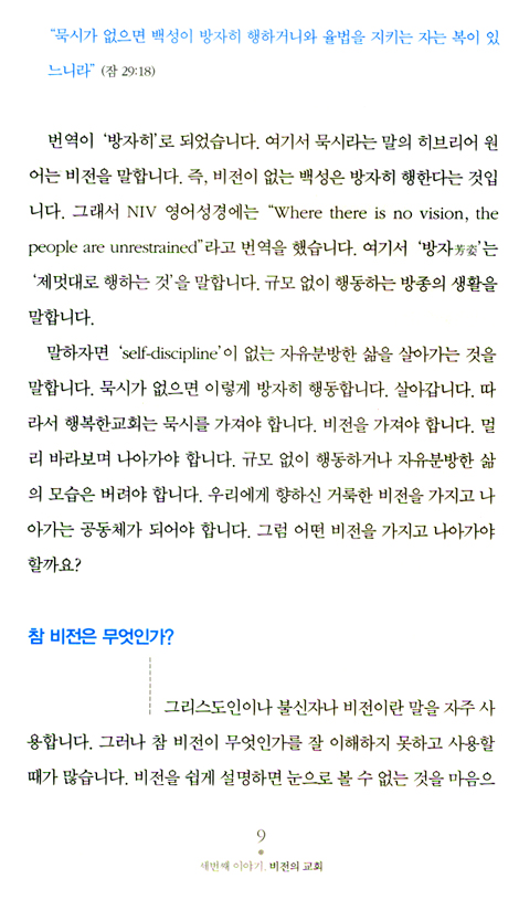 생동감 있는 교회가 젊은 교회입니다. 비전을 품고 가는 젊은 교회는 어떤 교회입니까? 생동감이 있는 교회가 젊은 교회입니다. 젊음의 특징은 힘과 패기입니다. 정열이 있습니다. 생동감이 있습니다. 나이는 젊지만 생동감이 없으면 그는 더 이상 젊은이가 아닙니다. 교회도 마찬가지입니다. 젊은 교회는 짧은 역사를 가진 교회를 말하지 않습니다. 젊은 교회는 연륜을 가진 교회를 말하지 않습니다. 생동감 있는 교회가 젊은 교회입니다. 변화를 두려워하지 않는 교회가 젊은 교회입니다. 젊은 교회는 새로운 도전을 합니다. 하나님이 기뻐하시는 일에 기꺼이 순종합니다. _2권 본문 42쪽