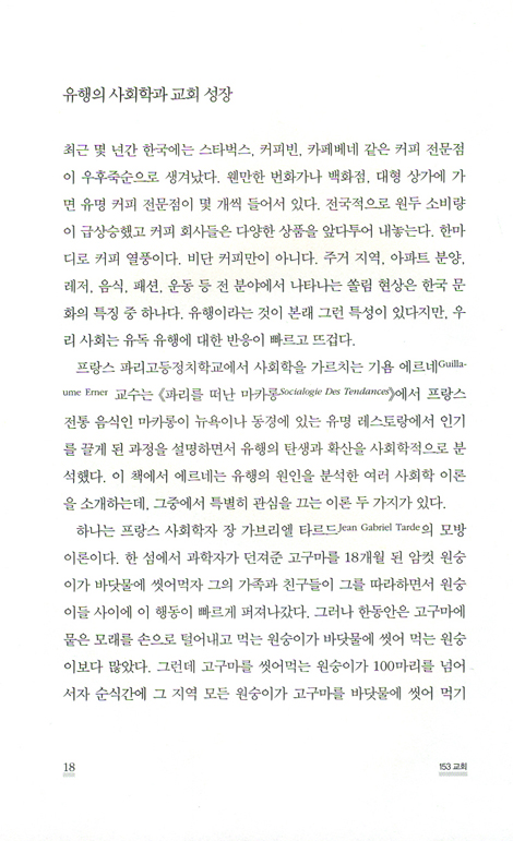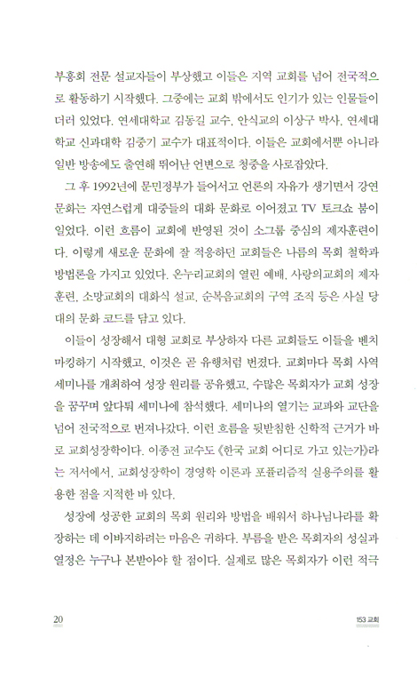 153이라는 숫자에는 상징적인 의미만이 아니라 실제적인 의미가 있다. 현실적으로 볼 때 150명은 목회자 한 사람이 공동체의 본질을 지키면서 건강하게 목회할 수 있는 성도의 최대 수다. 그래서 나는 21세기 한국 교회가 처한 현실에서 목회자들이 성도 수가 150명을 넘지 않는 교회, 즉 153 교회를 바람직한 교회 모델로 삼아야 한다고 단언한다. 이 책에서 제시하는 153 교회는 세속적 가치에 함몰되어버린 한국 교회가 목회의 본질을 회복하고, 나아가 대형 교회의 문제점을 보완하고 해결할 수 있는 실제적인 대안이다. _pp.46-47