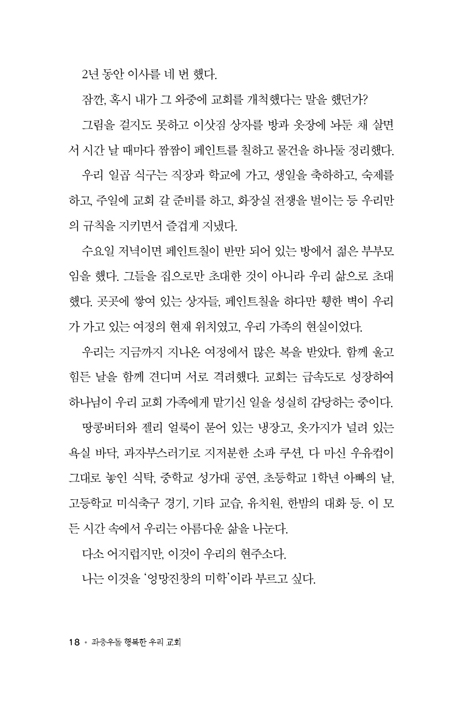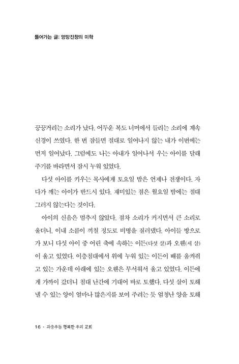 이 책에서 저자는 예배사역자답게 교회 안의 다양한 세대와 계층이 함께 참여할 수 있는 ‘다세대 예배’를 소개한다. 뉴라이프 교회 때부터 실천해 온 다세대 예배에 대한 경험과 고민, 제안은 이 아이디어가 단순히 하나의 이벤트가 아니라 가족을 기반으로 하는 공동체성 회복에 결정적 열쇠가 될 수 있음을 보여 준다. 교회 안팎에서 교회 때문에 마음 아파하고 속상해 하는 이들이 많다. ‘좋은 교회’에 대한 우리 자신과 이 시대의 기준에 대해 다시 한 번 돌아볼 때다. 늘 좌충우돌하더라도 그 과정을 통해 한 몸으로 빚어지고 있다면, 그 교회는 행복한 교회다. 이 책이 당신의 교회가 그렇게 되는 계기로 사용되기를 소망한다.