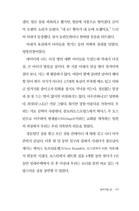 가족 같은 교회는 당신이 익히 알고 있는 교회보다 혼란스럽고 어수선할 수도 있다. 당신이 별로 좋아하지 않는, 엉망진창에 뒤죽박죽인 상황도 일어난다. 그러나 그것이 현실적이고 실제적이며…건강하다. 분명 어지럽고 혼란스러울 것이다. 그러나 아름다운 혼란이다._ 20쪽