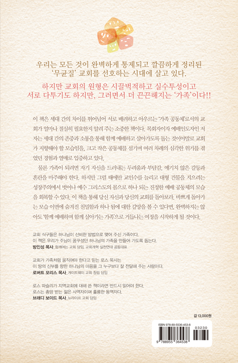 교회란 무엇인가? 하나님이 계획하신 교회의 본질은 무엇인가? 우리 교회가 하나님이 진짜 원하시는 신앙 공동체로 거듭나는 길은 무엇인가? 이 책은 이러한 질문에 교회는 ‘가족’의 모습을 담아내야 한다고 말한다. 모든 것이 정형화되고 예배 순서가 잘 짜여 있으며 유아부부터 장년부에 이르기까지 각 부서가 체계적으로 잘 운영되고 아무런 문제없이 교인의 수가 늘어나는 교회, 즉 소위 무균질 교회가 아니라 모든 세대가 하나로 아우러지며 부족하면 부족한대로 지지고 볶고 울고 웃으며 함께 살아가는 진짜 ‘가족’ 같은 교회가 되어야 한다고 말한다.