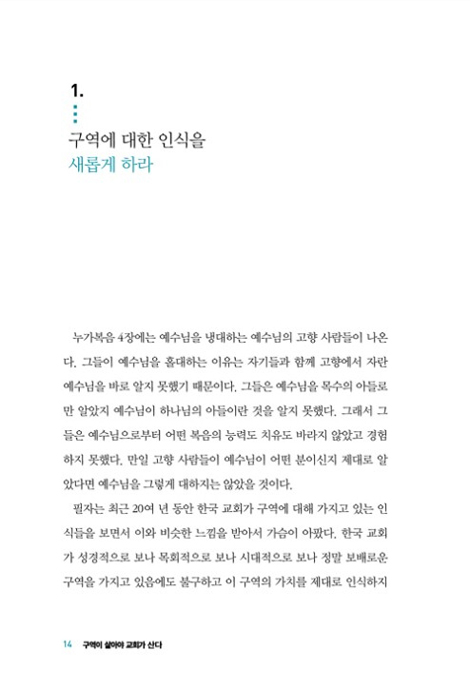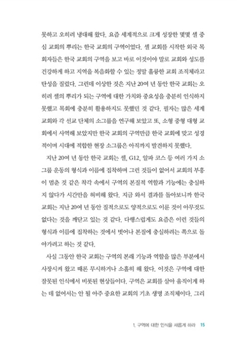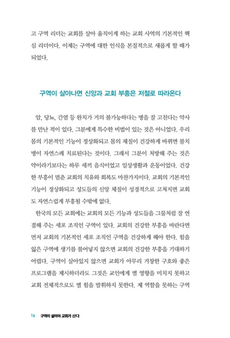 한국의 모든 교회에는 교회의 모든 기능과 성도들을 그물처럼 잘 연결해 주는 세포 조직인 구역이 있다. 교회의 건강한 부흥을 바란다면 먼저 교회의 기본적인 세포 조직인 구역을 건강하게 해야 한다. 힘을 잃은 구역에 생기를 불어넣지 않으면 교회의 건강한 부흥을 기대하기 어렵다. _ p.16