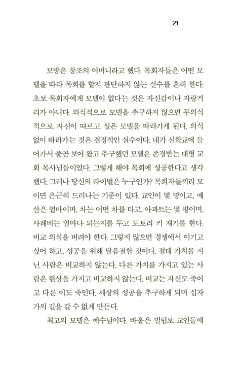 작은 교회는 전문인을 고용하지 않는다. 목회자와 교인 사이에 사업가와 고객의 관계가 존재하지 않는다. 월급을 줘야 일을 하는 사람은 가족이 아니라 직원이다. 교회에 직원은 없다. 직원이 있어야 하는 교회는 이미 가족이라는 적정 규모를 벗어난다. 작은 교회는 배당되거나 할당된 일이나 사람도 없다. 관리인으로 돌보고 책임져야 할 대상도 없다. 다 함께 책임을 지고, 다 함께 돌보고, 다 함께 배려한다. 교회가 작아야 하고, 작은 교회가 가족이라는 핵심 가치를 지녀야 하는 이유가 여기에 있다. 조직은 조직체와 사람을 분리시킨다. 가족과 같은 교회는 고객을 만족, 감동, 졸도시킬 정도로 서비스의 질을 높이기 위해 이벤트를 할 필요가 없는 교회이다. 자연적인 모습으로 진심이 통하고, 잘하면 잘하는 대로 못하면 못하는 대로 서로를 인정하고 격려하고 함께 도우며 부족을 채워 주는 교회가 가족과 같은 교회이다. 그래서 교역자에게 필요한 덕목은 재주나 재능이나 열정이 아니라, 정직과 진심과 성실이다.