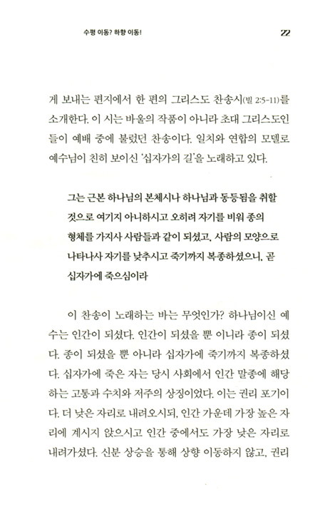 수평 이동이 한국 교회 병리 현상의 주범이라고 한다. 동의하지 않는다. 함께 사역하였던 제자 목사가 개척을 했다. 이전에 있던 교인들이 몇 명 갔다. “그 교회는 수평 이동으로 존재하는 교회냐” 항의를 듣는다고 했다. 수평 이동은 무슨 수평 이동? 아니다. “우리 교회는 하향 이동을 시키는 교회라고 반박해라”고 했다. 흔히 쓰이는 수평 이동은 사회과학 용어로 정확히 말하면 ‘사회 이동’이다. 한국 교회는 수평 이동이 아니라 사실 상향 이동을 해왔다. 더 좋고 더 낫고 편하고 큰 환경으로의 이동이었다. 좋은 설교와 안락하고 쾌적한 환경, 최첨단 시설과 편리한 근접성과 주차 공간을 따라서 옮겨 갔다. 이제는 다시 내려올 때다. 개척 교회와 농촌 교회는 쓰러지고 말라 가고 있다. 수평 이동하지 말고 하향 이동을 할 시간이다. 중심이 아닌 변두리로, 인정을 받지 못하고 대우를 해주지 않는 곳으로 갈 시간이다.