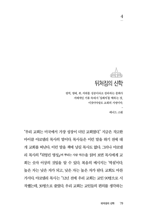 “반드시 반전이 일어난다. 첫째가 꼴찌되고, 꼴찌가 첫째된다. 가장 작은 씨앗인 겨자씨는 큰 나무로 자랄 것이다. 밀알이 죽으면 오히려 더 크게 살아난다. 잃은 자를 찾을 것이다. 잔치에 초대받지 못한 자가 초대받게 될 것이다.” 당신의 교회도 뒤처져 있다고 생각하는가? 그렇다면 첫째가 되리라는 사실을 믿어라. 지금 여기서만 상상할 수 있으나 이루어질 수 있는 미래를 상상하며, 예수님의 눈으로 당신 교회를 바라보라._59p