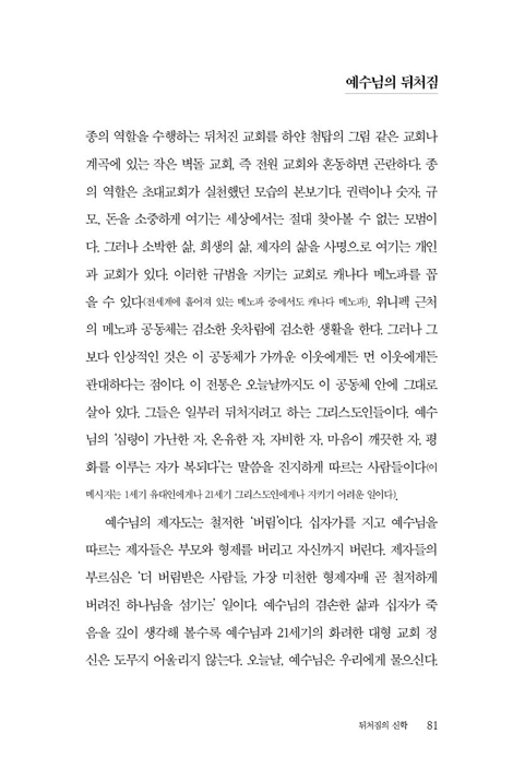 10년 안에 교인 수를 두 배로 늘려야 한다는 생각을 버려라. 교회를 성공의 발판이나 은퇴의 자리쯤으로 여기지 말고 영성 계발을 위한 수도 공간으로 만들어 보라. 교회가 농촌의 흙길이 끝나는 외진 곳에 있느냐, 복잡한 도심에 있느냐는 아무 상관없다. 이러한 교회는 켄터키 주 벽지, 겟세마네 언덕에 있는 토머스 머튼의 은신처처럼 거룩한 장소가 될 수 있다. 번잡하고 시끄러운 뉴욕 거리에 있는 도로시 데이의 방 두 개 딸린 집처럼 분주한 도시의 영적 피난처가 될 수도 있다._19p