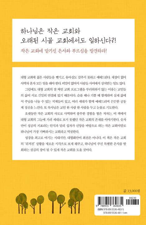 성장을 최고로 여기는 시대지만, 대형화만이 최선은 아니다. 이 책은 작은 교회의 ‘뒤처진’ 상황을 새로운 시각으로 보게 해주고, 하나님이 주신 특별한 은사를 발휘하는 섬김의 장이 될 수 있게 작은 교회를 도울 것이다.