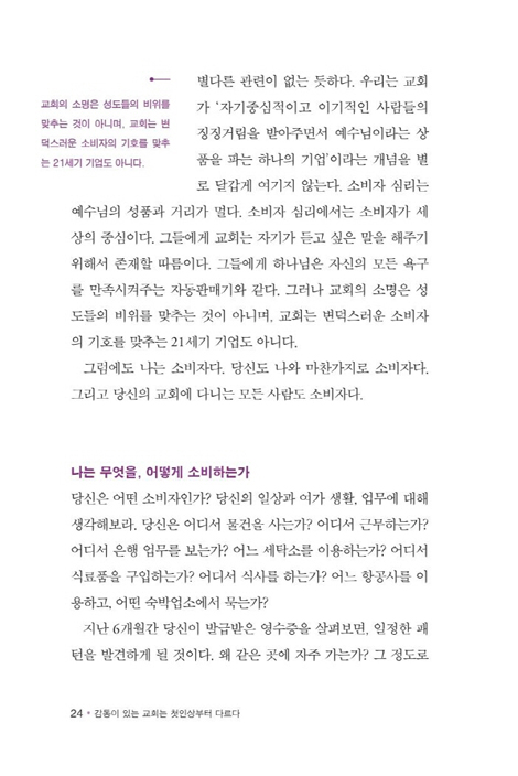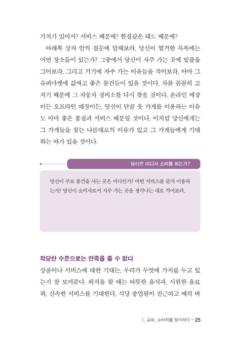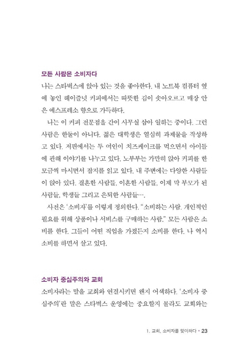 우리는 신앙을 찾고 있는 사람들도 소비자라는 사실을 기억해야 한다. 물론 소비자라는 말이 지나치게 상업적으로 들릴 수 있으며 심지어 천박하게 들릴 위험도 있다. 그러나 공정하게 생각해보면 그들이 소비자라는 것은 사실이다. 예수님에 대한 가르침이 어떤 것인지 알아보거나 신앙을 갖고 싶어 하는 사람들도 실은 교회에 와서 쇼핑하는 사람들이라고 볼 수 있기 때문이다. 다시 말하면 그들은 교회가 자기들의 영적인 필요를 채워줄 수 있는지를 알아보고, 그것을 쇼핑하려고 하는 것이다. 우리는 이러한 그들의 모습을 그대로 받아들여야 한다. 누군가로부터 고달픈 인생 문제에 대한 도움을 얻으며 누군가의 돌봄을 받으려는 기대를 품고 교회로 찾아온 사람들을 영접해야 한다. _1. 교회, 소비자를 맞이하다(34면)