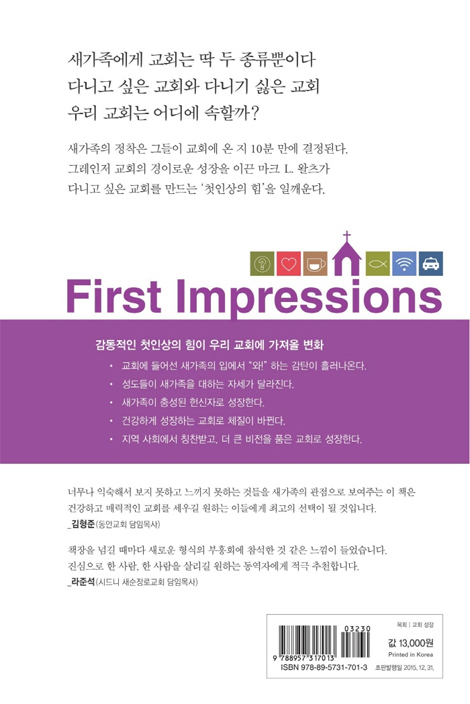 교회를 처음 방문한 사람들은 건물 혹은 주차장에 발을 들여놓는 순간, 즉 설교나 찬양대의 찬양을 듣기도 전에 첫인상으로 당신의 교회를 판단한다. 나는 교회 방문객들에게 잊지 못할 첫인상을 남기는 것이야말로 사역의 핵심이라고 누누이 가르쳐왔다. 첫인상 사역은 담당 부서가 얼마나 뛰어난지 드러내기 위해 하는 것이 아니다. 사람들이 예수님에게 호감을 느끼도록 돕고, 주님이 소중히 여기는 사람들에게 인격적으로 다가가 그들이 스스로의 가치를 깨달을 수 있도록 돕는 사역이다. 그레인저 커뮤니티 교회에서는 ‘첫인상 사역’이 모든 사역의 중심이다. 첫인상 사역 팀에 속한 봉사자들은 우리 교회를 방문한 사람들이 다음 주에도 이곳으로 발걸음을 옮기도록 하는 데 역점을 두고 그들을 섬긴다. 가치를 느끼면 그들은 다시 찾아온다. _프롤로그(15~16면)
