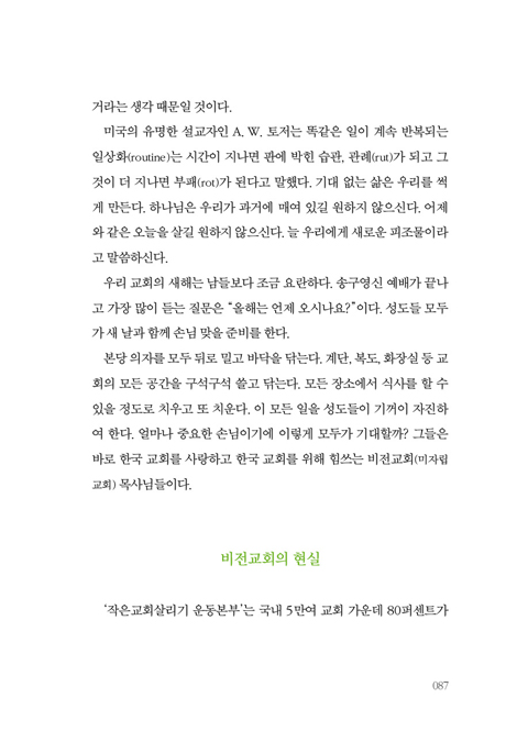시인 이상은 “절망은 기교를 낳고, 그 기교 때문에 또 절망한다”라고 말했다. 교회가 부흥하지 않는다고 해서 요행을 부리거나 얕은 수를 쓰면, 그 수에 제가 넘어지고 만다. 부흥의 본질은 우리의 마음이다. 부흥을 위해 목숨도 아깝지 않게 여기는 마음이다. 하나님의 나라를 위해 기꺼이 우리의 삶을 바치는 각오다. _ 본문 117쪽