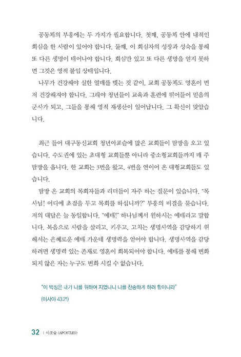 [아포슬]은 생명사역이 얼마나 놀라운 부흥과 성장을 일으키는지를 구체적으로 보여주고 있습니다. 한 번 읽어 보고 서재에 꽂아두지 마시고, 정독하고 소화해서 실천에 옮겨 보십시오. 무엇보다 대구동신교회 생명사역이 무엇인지 관심을 가지고 연구해 보십시오. 여러분과 여러분 교회도 반드시 생명사역의 열매를 거두게 될 것입니다!