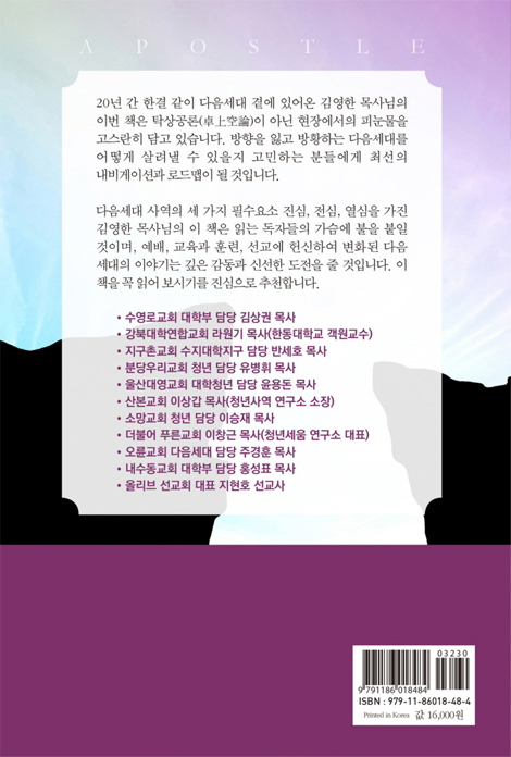 20년 간 한결 같이 다음세대 곁에 있어온 김영한 목사님의 이번 책은 탁상공론(卓上空論)이 아닌 현장에서의 피눈물을 고스란히 담고 있습니다. 방향을 잃고 방황하는 다음세대를 어떻게 살려낼 수 있을지 고민하는 분들에게 최선의 내비게이션과 로드맵이 될 것입니다.