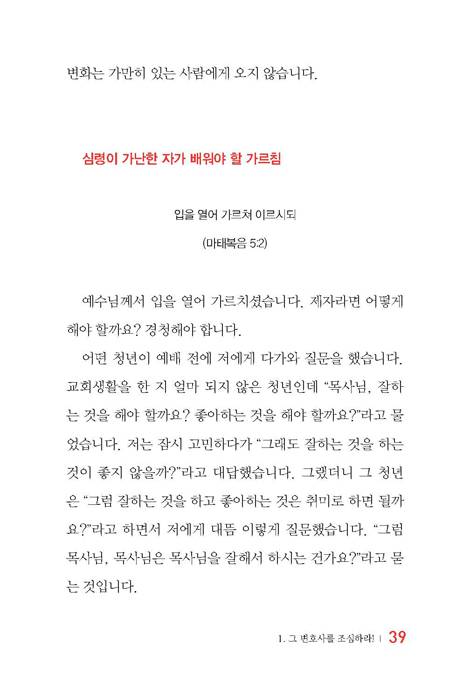 이번 설교집은 착실한 개혁주의 성경해석을 바탕으로 청년들의 눈높이에 맞춘 메시지입니다. ‘집으로 들고 갈 수 있는(take-home)’ 삶의 적용이 있고 재미와 유머가 있으면서도 진지하고 의미심장한 내용입니다.