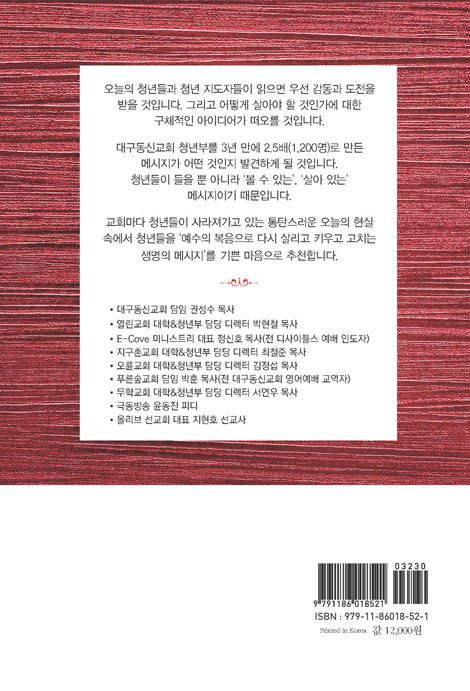 교회마다 청년들이 사라져가고 있는 통탄스러운 오늘의 현실 속에서 청년들을 ‘예수의 복음으로 다시 살리고 키우고 고치는 생명의 메시지’를 기쁜 마음으로 추천합니다.