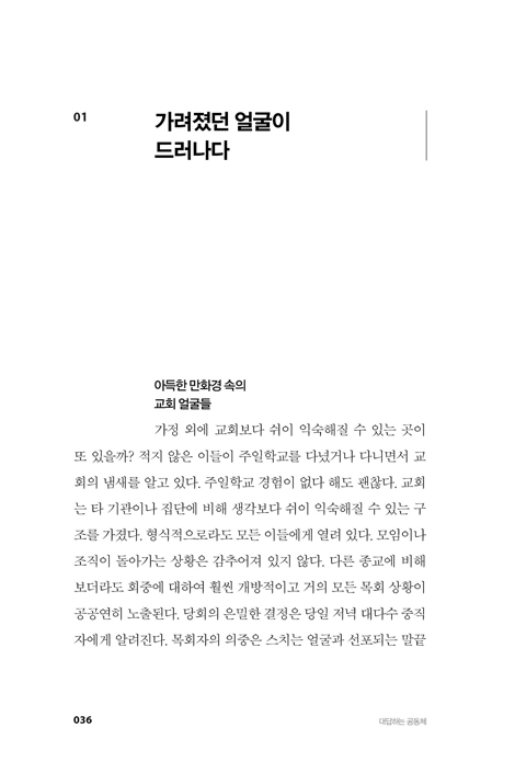 무엇보다 교회는 예수 그리스도의 몸이다. 예수는 하나님 보좌 우편으로 가셨지만 이 땅에서 여전히 자신을 볼 수 있도록 자신의 몸을 남기신 것이다. 그러므로 교회를 보면 예수 그리스도를 볼 수 있어야 한다. 하지만 지금 교회가 과연 예수님을 보여줄 수 있는가? 세상이 교회를 통해 무엇을 보고 있는지는 세상에게 물어야 하겠지만, 우리도 눈치껏 알고 있다. _p151