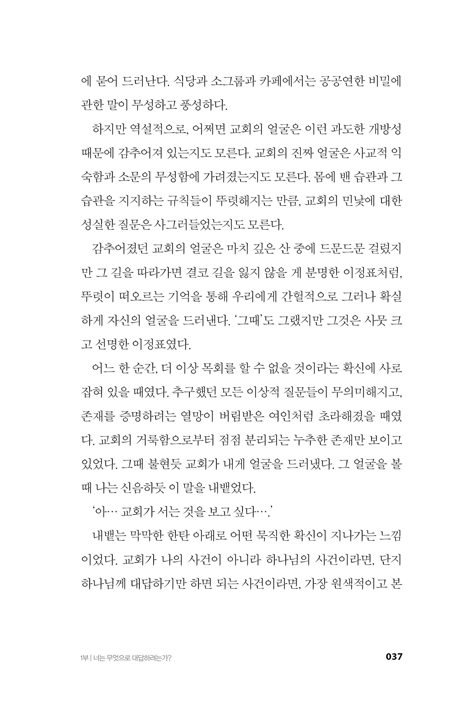 책 전체에 담긴 저자의 교회로서의 대답은 마치 오랜 상처의 흔적을 벌거벗고 드러내듯, 부끄러움마저 무릅쓰고 자신의 실패와 상실과 어두운 과거마저 솔직히 드러내는 방식이다. 어쩔 수 없는 사실인지라 성공과 성취를 기록한 대목에서도 반성과 문제의식을 순식간에 나타낸다. 실패하고 좌절했던 대목은 당연히 감추거나 미화하려 들지 않는다. 분노했던 속마음, 우쭐했던 자의식을 그대로 폭로한다.