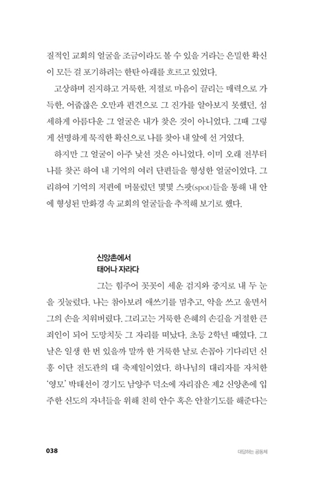 그가 태어나 자란 곳은 한국 이단 공동체의 맏형격인 신앙촌, 10살 때 가족이 그 집단과 결별한 후 수년의 공백기 끝에 서울 송파에서 한 장로교회를 만난 적은 청소년기였다. 그는 그곳에서 ‘물리적 교회’에 담긴 ‘인격적 교회’를 만났다. 육욕적 연약함을 파고 들어오시는 하나님의 손길 덕분에 성공에서 성장으로 방향을 트는 특혜를 얻었고, 목회를 ‘당하는’ 자로서 부름받은 후에는 목회의 본질을 고민하기 전에 자신의 지질함과 은밀한 우상들을 먼저 직면해야 했다. 하나님께서 그에게 요청하신 여정은 끝없이 말을 걸어오시는 하나님의 질문과 교회를 향해 말없이 묻는 세상의 무거운 질문에 대하여 대답하는 교회가 되어가는 걸음이었다.
