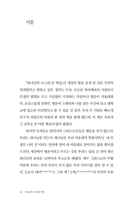 쉽게 읽히면서도 우리의 의식에 깊은 자국을 남기고 삶을 근원적으로 변화시키는 책이 있다. 그런가 하면, 시간이 지날수록 그 의미가 더욱 분명히 드러나고 시대적 적합성을 증명하는 예언자적 메시지를 품고 있는 저작도 있다. 현대 미국 신학을 대표하는 두 거장의 협업과 우정의 결과물인 『하나님의 나그네 된 백성』이야말로 바로 그러한 책이다. 하우어워스와 윌리몬의 소박하고 진솔하며 유쾌한 글쓰기에는 현대 문명을 비판적으로 해부하고 교회의 본질적 사명을 재발견하게 해줄 소중한 신학적 통찰과 수사학적 힘이 배어 있다. 소비주의와 군사주의, 업적주의, 개인주의의 포로가 되어 있는 현대인에게 이 책은 그리스도인의 일차적 사명은 세상을 변혁하는 것이 아니라 ‘교회를 교회 되게 하는 것’임을 자각하게 해준다. 이번 판에 새롭게 포함된 윌리몬의 서문과 하우어워스의 후기는 이 책을 처음 접한 이들에게 신뢰할 만한 독서의 안내자가 되어 줄 것이고, 이 책을 다시 읽는 이들에게는 더욱 풍성한 해석과 이해의 기쁨을 선사해 줄 것이다.