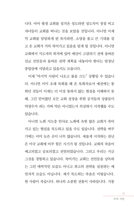 포기한다는 것이 꼭 교회 문을 걸어 잠그고 집으로 간다는 의미는 아닙니다. 하나님이 끝내지 않으시면 우리도 끝내지 않습니다. 더 남아 있습니다. 생명이 남아 있고 소망이 남아 있습니다. 하지만 그것이 어떤 모습인지를 알아야 한다는 부담감에서 벗어납니다. 스러져가는 우리 힘으로 새로운 생명을 낳아야 한다는 짓누르는 사명감에서 자유로워집니다. 두려움 과 실패에 대한 무게가 아닌 자유함과 믿음으로 미래를 맞이하기 시작합니다. 성공을 포기할 때 우리는 자유로워집니다. 사역의 열매를 장수와 풍성과 인기라는 잣대로 평가하지 않고, 예수님의 사 역에서 드러났던 하나님 사랑과 이웃 사랑이라는 잣대로 평가하게 됩니다. 우리 교회가 자리를 채워 수적으로 부흥하려는 노력을 그만둔다면, 우리 교회는 이웃과 함께 사랑하고 사랑 받고, 용서하고 용서받고, 환영하고 환영받는 것을 연습하는 곳이 될 수 있습니다. 죽음과 부활의 거룩한 이야기에 동참하며 우리에게 남은 모든 시간을 풍성하게 살 수 있습니다. p. 14,15