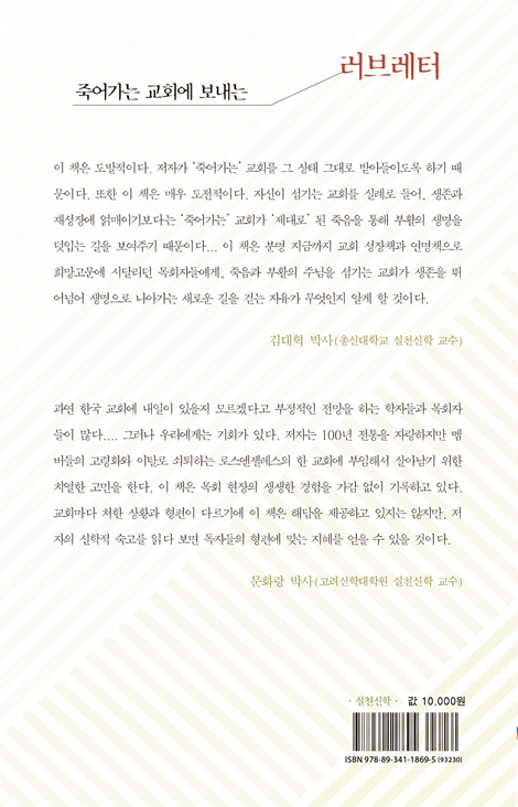 이 책은 도발적이다. 저자가 ‘죽어가는’ 교회를 그 상태 그대로 받아들이도록 하기 때문이다. 또한 이 책은 매우 도전적이다. 자신이 섬기는 교회를 실례로 들어, 생존과 재성장에 얽매이기보다는 ‘죽어가는’ 교회가 ‘제대로’ 된 죽음을 통해 부활의 생명을 덧입는 길을 보여주기 때문이다... 이 책은 분명 지금까지 교회 성장책과 연명책으로 희망고문에 시달리던 목회자들에게, 죽음과 부활의 주님을 섬기는 교회가 생존을 뛰어넘어 생명으로 나아가는 새로운 길을 걷는 자유가 무엇인지 알게 할 것이다.