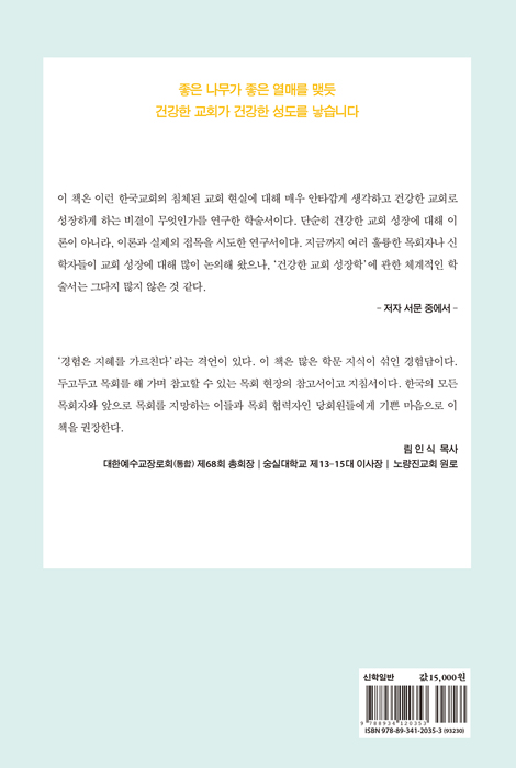 이 책은 이런 한국교회의 침체된 교회 현실에 대해 매우 안타깝게 생각하고 “건강한 교회로 성장”하게 하는 비결이 무엇인가를 연구한 학술서이다. 단순히 건강한 교회성장에 대한 이론이 아니라, 이론과 실제의 접목을 시도한 연구서이다. 지금까지 여러 훌륭한 목회자나 신학자들이 교회성장에 대해 많이 논의해 왔으나, ‘건강한 교회성장학’이란 체계적인 학술적 연구서는 그다지 많지 않은 것 같다. 왜냐하면, 교회성장에 대해 많은 목회자가 경험적인 측면에서 쉽게 공유하고 있으나, 체계적인 학술적 처방을 제시하기는 쉽지 않기 때문이 아닐까?
