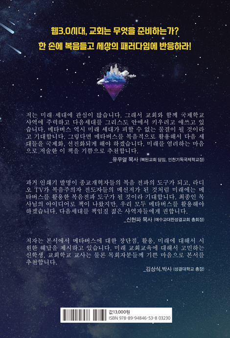 과거 인쇄기 발명이 종교개혁자들의 복음 전파의 도구가 되고, 라디 오 TV가 복음주의자 전도자들의 메신저가 된 것처럼 미래에는 메 타버스를 활용한 복음전파 도구가 될 것이라 기대합니다. 최종인 목 사님의 아이디어로 책이 나왔지만, 우리 모두 메타버스를 활용해야 하겠습니다. 다음세대를 책임질 젊은 사역자들에게 권합니다.