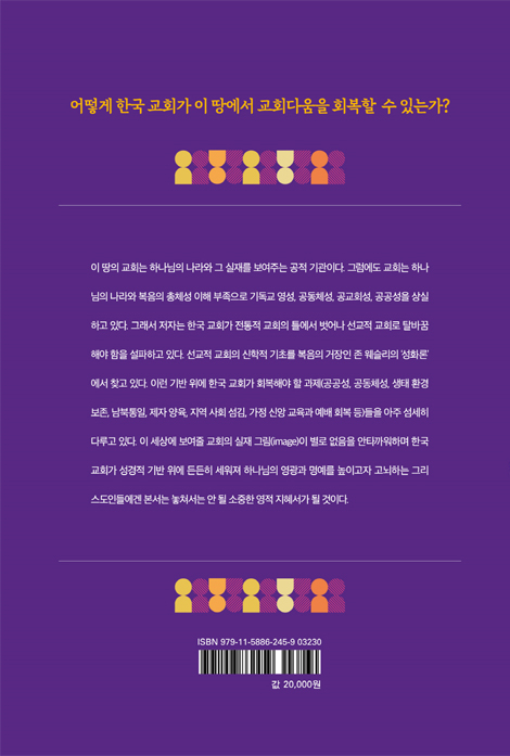 이 땅의 교회는 하나님의 나라와 그 실재를 보여주는 공적 기관이다. 그럼에도 교회는 하나 님의 나라와 복음의 총체성 이해 부족으로 기독교 영성, 공동체성, 공교회성, 공공성을 상실 하고 있다. 그래서 저자는 한국 교회가 전통적 교회의 틀에서 벗어나 선교적 교회로 탈바꿈 해야 함을 설파하고 있다. 선교적 교회의 신학적 기초를 복음의 거장인 존 웨슬리의 ‘성화론’ 에서찾고있다.이런기반위에한국교회가회복해야할과제(공공성,공동체성,생태환경 보존,남북통일,제자양육,지역사회섬김,가정신앙교육과예배회복등)들을아주섬세히 다루고 있다. 이 세상에 보여줄 교회의 실재 그림(image)이 별로 없음을 안타까워하며 한국 교회가 성경적 기반 위에 든든히 세워져 하나님의 영광과 명예를 높이고자 고뇌하는 그리 스도인들에겐 본서는 놓쳐서는 안 될 소중한 영적 지혜서가 될 것이다.