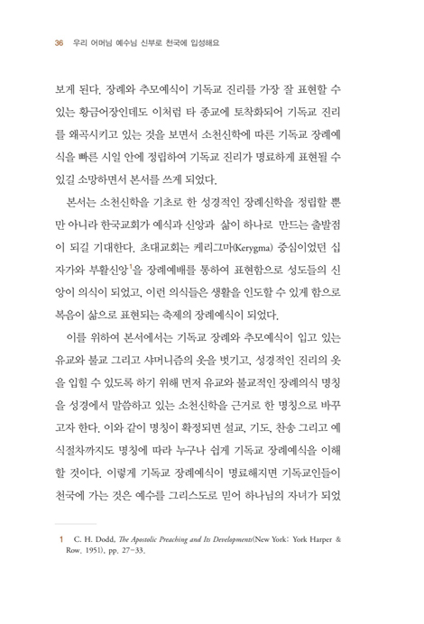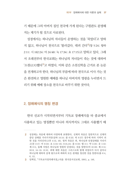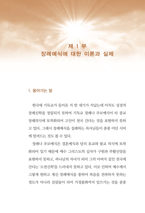 본서는 소천신학을 기초로 한 성경적 장례신학을 정립한 후 그에 따른 장례예식들의 실례들을 제공한다. 특히 저자는 기독교장례예식에서 조차도 유교와 불교의 영향을 받아서 잘못된 용어를 사용하고 있음을 지적하면서 성경에 맞게 장례예식의 용어를 바꾸어 사용함으로 천국에 대한 대망을 갖도록 해야 할 것을 말하고 있다.