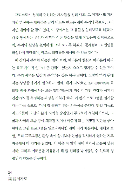 제자훈련을 하는데도 아무런 변화가 일어나지 않는다면 한번 점검해 봐야 한다. 제자훈련이 친밀한 관계만을 강조하는 소그룹의 기능만 남아 있지는 않은지, 여러 가지 성경적 지식만 전달하는 강의는 아닌지, 아니면 매주 듣는 또 하나의 설교는 아닌지. 그레그 옥던이 제자훈련의 힘이라고 제시하는 친밀함, 진리, 그리고 책임감의 세 가지 기능이 살아 있는 제자훈련이라면 우리는 분명히 영적 성장과 변화를 우리의 두 눈으로 보고 경험하게 될 것이다.
