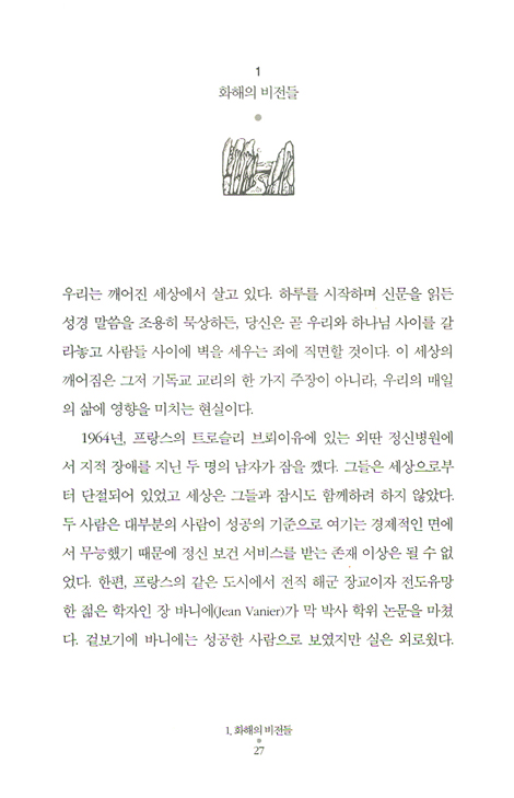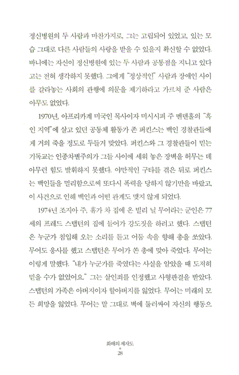 이러한 깨달음 속에서, 우리는 비로소 화해로서의 평화가 우리 외부에 있는 문제와 폭력에 대해 해결책을 제시하고 세상을 변화시키려는 거대한 비전에만 머무는 것이 아니라 나의 변화를 포함하는 일상생활의 변화이기도 함을 알게 된다. 세상을 변화시키겠다는 평화에 대한 거대한 비전은 전문가나 특별한 사람의 몫일 수 있지만, 일상생활의 변화로서의 평화에는 누구나 참여할 수 있다. 그렇다고 일상생활의 변화로서의 평화가 쉽다는 의미는 결코 아니다. 폭력에 물든 자신과 일상생활을 평화와 화해로 변화시키는 것은 이벤트나 프로그램으로는 절대 불가능하다. 일상적인 평화와 화해는 시간을 필요로 하는 지속적인 과정이기 때문이다. _추천 서문 중에서