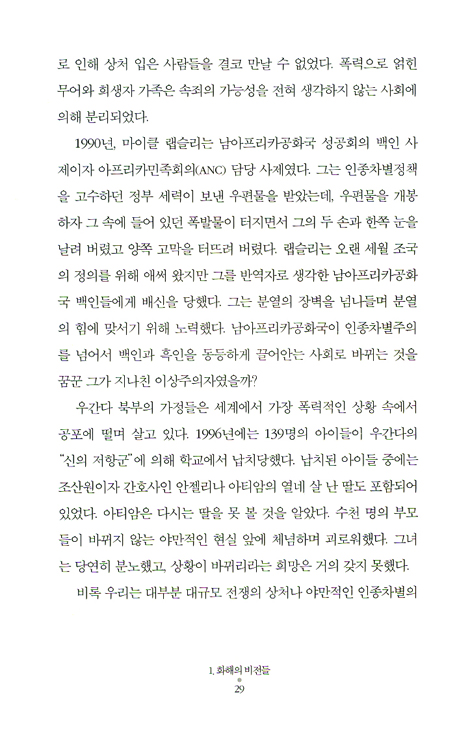 나의 유일한 걱정은 사람들이 이 훌륭한 책을 많이 읽지 않으면 어떡하나 하는 것이다. 이 책은 개인과 단체에 보석과도 같은 책이다. 회복과 화해의 방법을 정확히 배우지 않는다면, 우리에게는 미래가 없을 것이다.